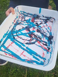 Les parents pourront placer préalablement des gouttes de peinture (trois couleurs différentes) directement sur la feuille qui est placée au fond du bac.